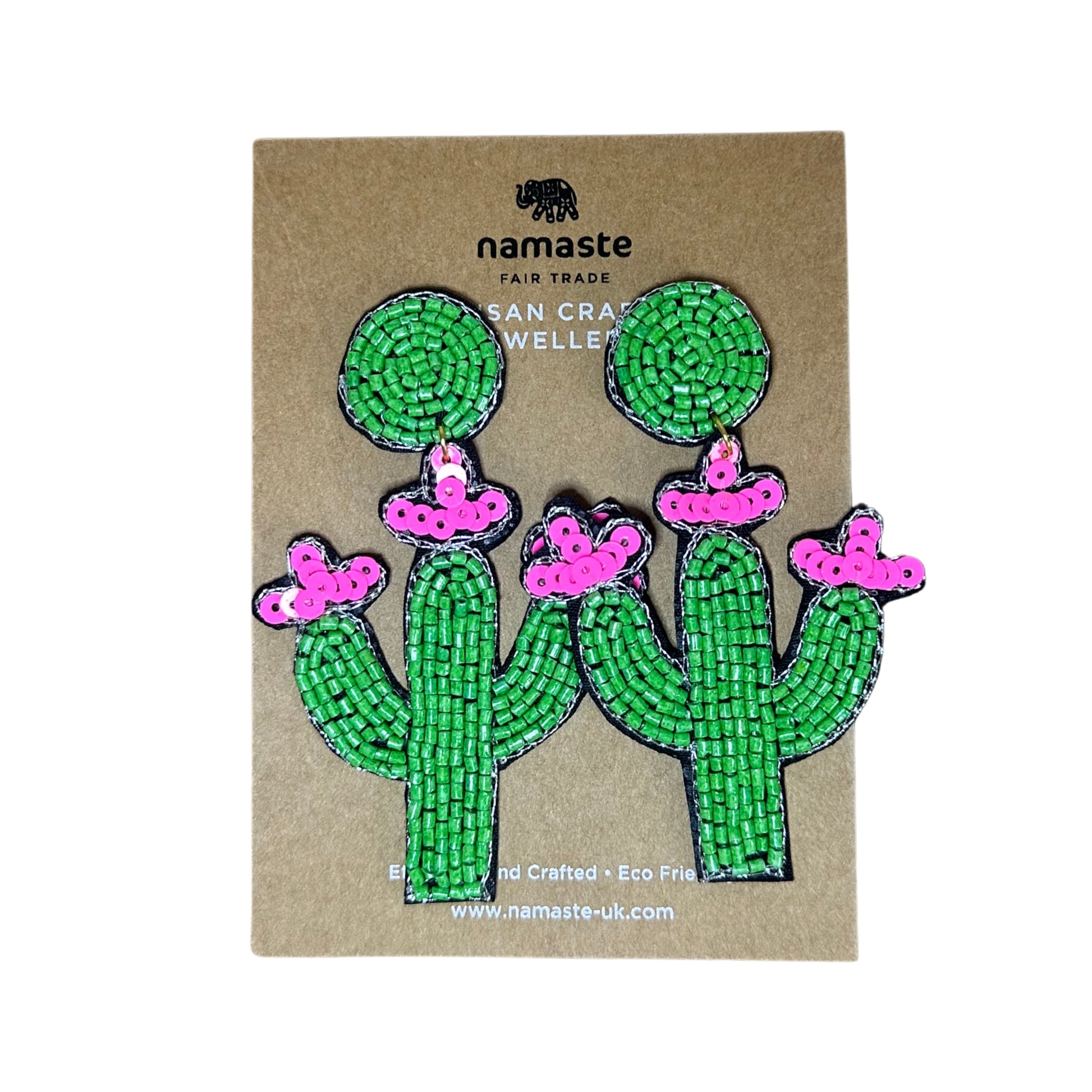Bring colour to any outfit with these hand-beaded cactus earrings, complete with pink blooms. Made in India from glass beads and cotton fabric, with natural variations that show the artisan’s touch. Perfect kris kringle gift or stocking filler for a Kooky Mama!