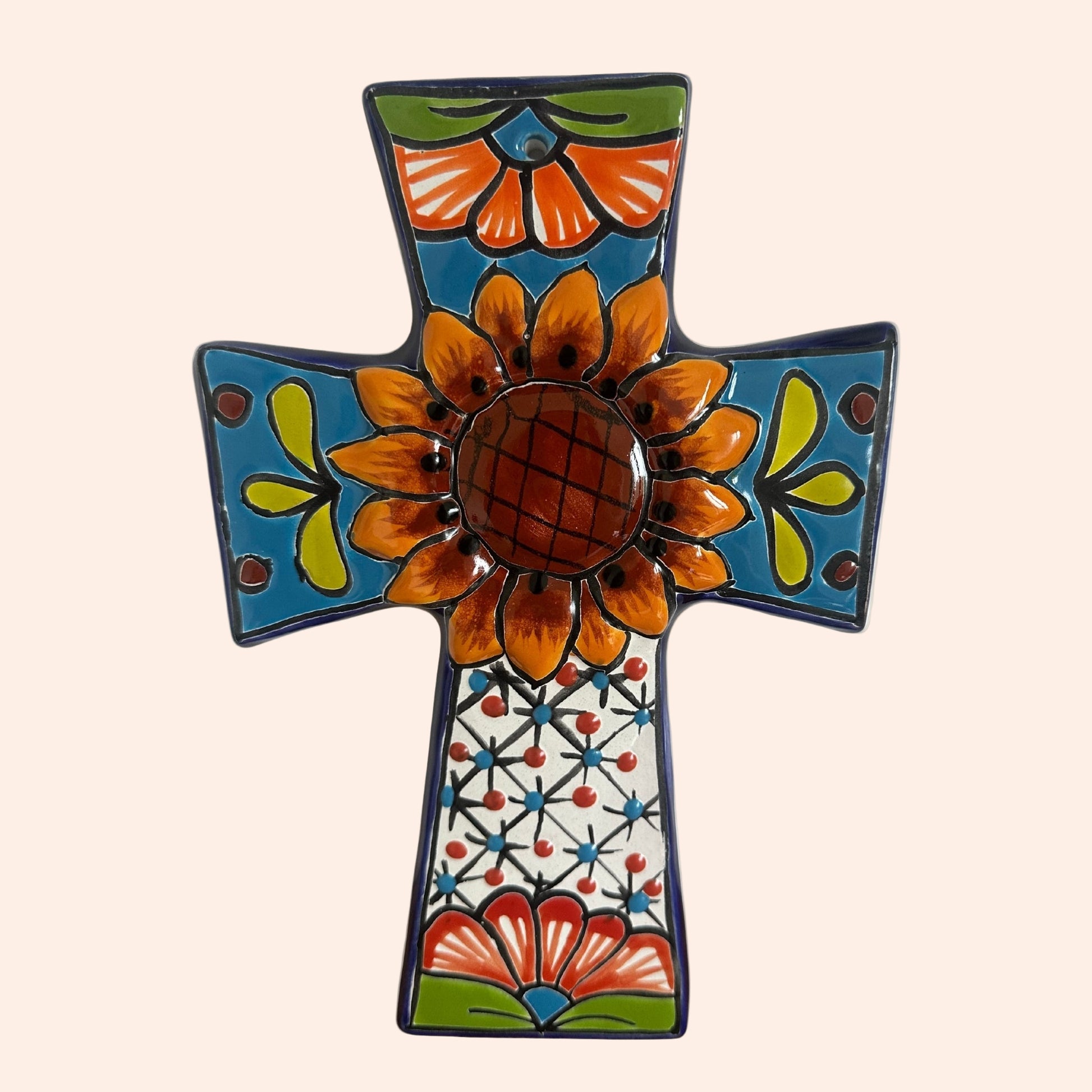Experience the vibrant culture of Mexico with a beautifully crafted Talavera cross adorned with sunflowers, from Contreras Designs. This 10-inch wall cross is a unique and stunning decorator piece. It's not just a wall accent; it's a conversation starter. Display it in your living space and let it bring a touch of Mexican charm to your home. ONLY 1 AVAILABLE